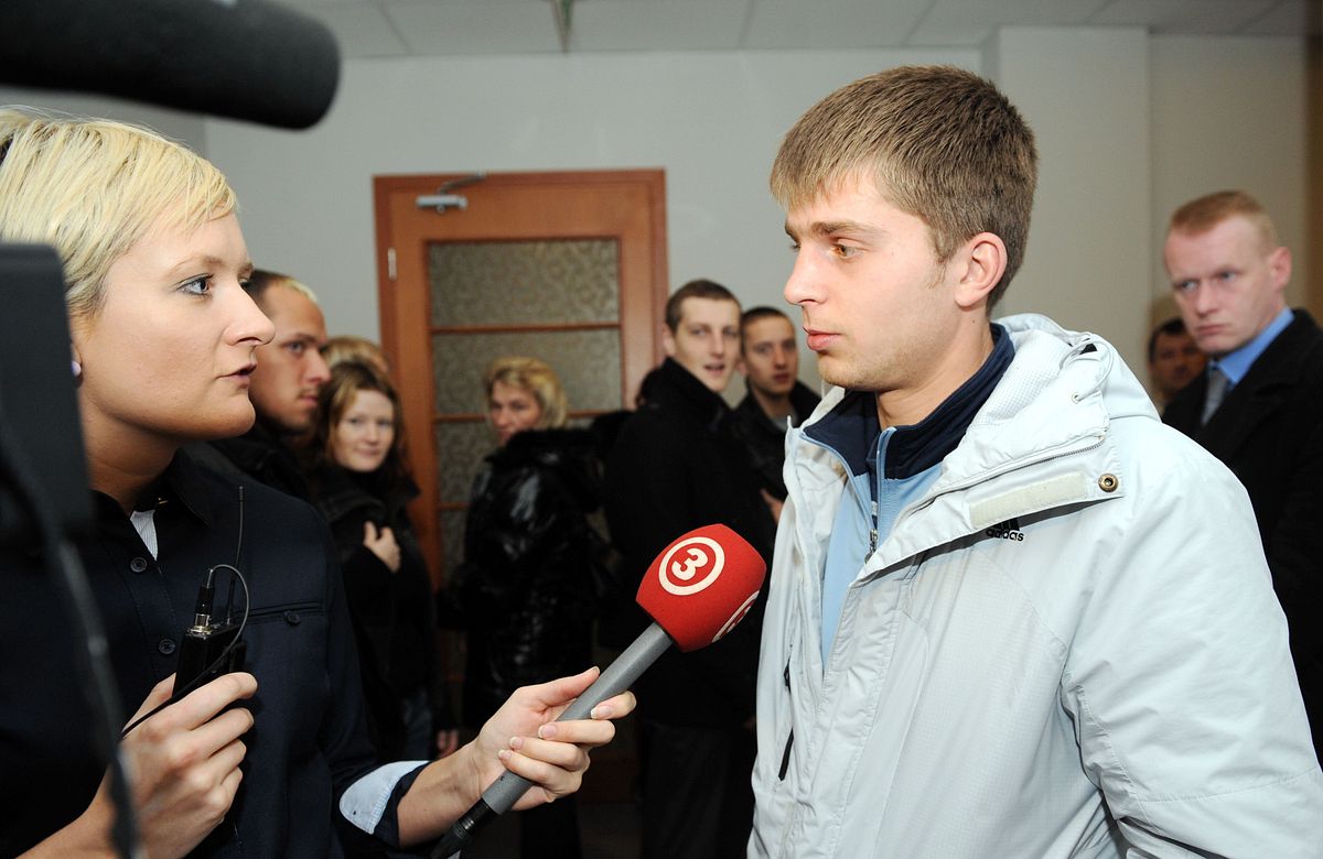 Žurnāliste uzdod jautājumus apsūdzētajam pirms pirmās tiesas sēdes Rīgas apgabaltiesā, kurā sāks izskatīt apjomīgo krimināllietu pret 68 personām, kuras apsūdzētas par piedalīšanos 2009.gada 13.janvārī Vecrīgā notikušajos grautiņos.