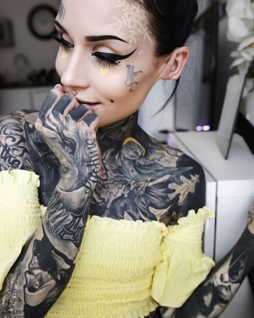Kopā ar vīru izdomājam, ko nākamo tetovēsim. Uz mana ķermeņa ir daudz tādu tetovējumu, kuriem ir dziļa nozīme, un ir arī daži, kas ir tetovēti, lai papildinātu mākslas darbu, radītu skaistumu. Un tomēr, ja dažiem tetovējumiem sākumā nav nozīmes vai stāsta, tad jēga atnāk pēc kāda laika. Jo katrs tetovējums ir kā atmiņa par kādu dzīves posmu, kad zīmējums tapa. Piemēram, uz pirkstiem man ir uztetovēts manas vecākās meitas vārds un dzimšanas datums, un arī uzraksts – all you need is love. Šos vārdus es saku visiem, jo patiesi ticu, ka viss, kas cilvēkam ir nepieciešams, ir mīlestība. Tāpat šajā teicienā uz pirkstiem slēpjas arī manas jaundzimušās meitiņas vārds Neo. Uz muguras man ir liels, sapņains attēls un uzraksts – Utopian Spirit. Tas raksturo manu garu, jo es vienmēr skatos uz visu ar pozitīvismu, visā mēģinu saskatīt tikai labo.