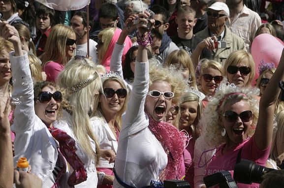 Simtiem blondu Latvijas sieviešu soļoja caur galvaspilsētu Rīgu, mēģinot atbalstīt nacionālo garu lejupslīdes laikā, atspoguļojot Latvijas blondīņu parādi, raksta BBC.