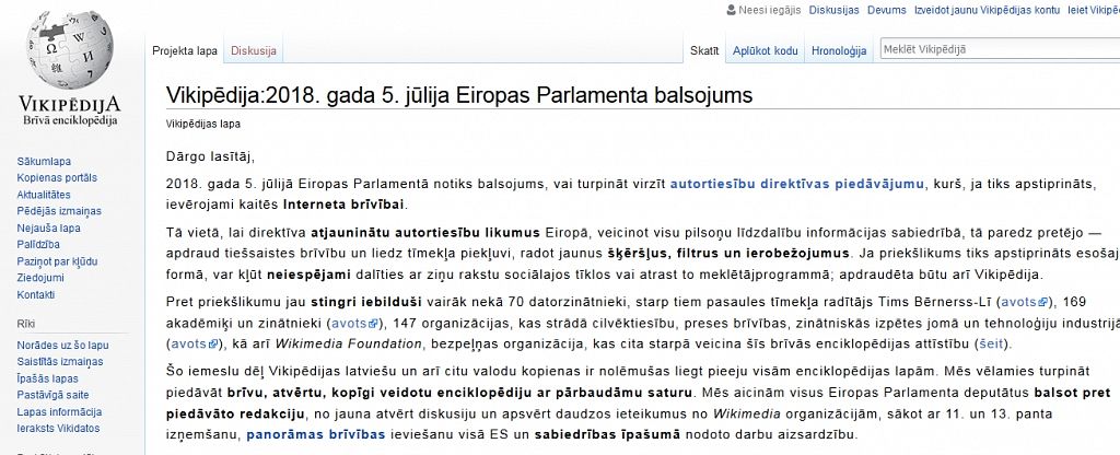 Vakar, dienu pirms EP balsojuma par autortiesību direktīvas virzību, «Vikipēdijas» latviešu valodas versija bija bloķēta. Izmantojot «Vikipēdiju» latviešu valodā, parādījās paziņojums, kura saturs vēstīja, ka 5.jūlijā EP notiks balsojums, vai turpināt virzīt autortiesību direktīvas piedāvājumu, «kas, ja tiks apstiprināts, ievērojami kaitēs interneta brīvībai».