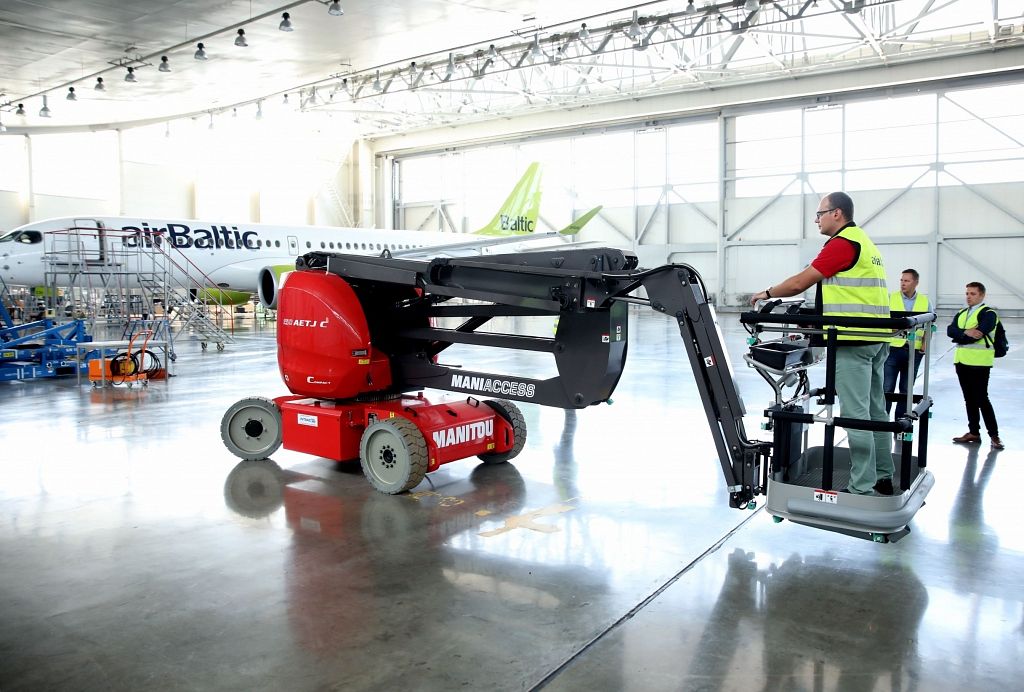SIA INTRAC Latvija lidsabiedrībai airBaltic (AIR BALTIC CORPORATION) piegādājusi elektrisko pacēlājplatformu Manitou AETJ 150 Compact lidmašīnu tehniskai apkalpošanai.
