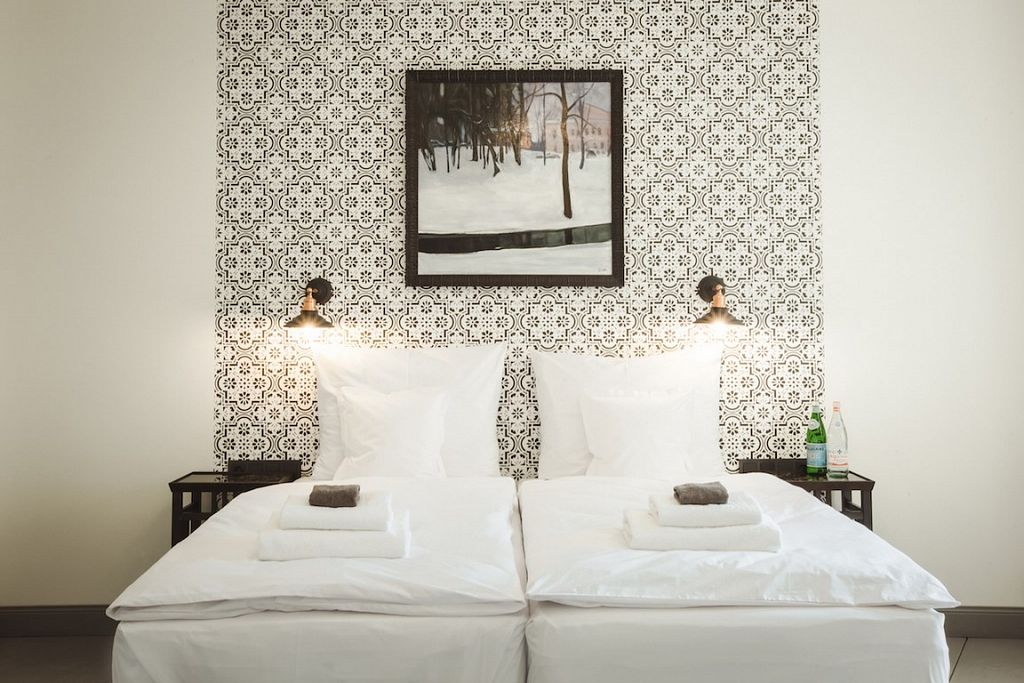 Viesnīcā pieejami 28 numuriņi ar mazāku un lielāku kvadratūru, pieejami arī plaši luksusa klases numuri, kā arī jumta numuriņi. Gan istabās, gan pārējās viesnīcas telpās apskatāmi pašmāju talantu – Džemmas Skulmes, Ģirta Muižnieka, Guntara Zaķa, Ivara Heinrihsona, Leo Svempa, Alvja Zemzara, Frančeskas Kirkes u. c. darbi. Noteiktas ekspozīcijas iecerēts regulāri mainīt. Telpās izvietotas arī vēsturisku darbu reprodukcijas, kas atklāj, kā savulaik izskatījusies ēka.