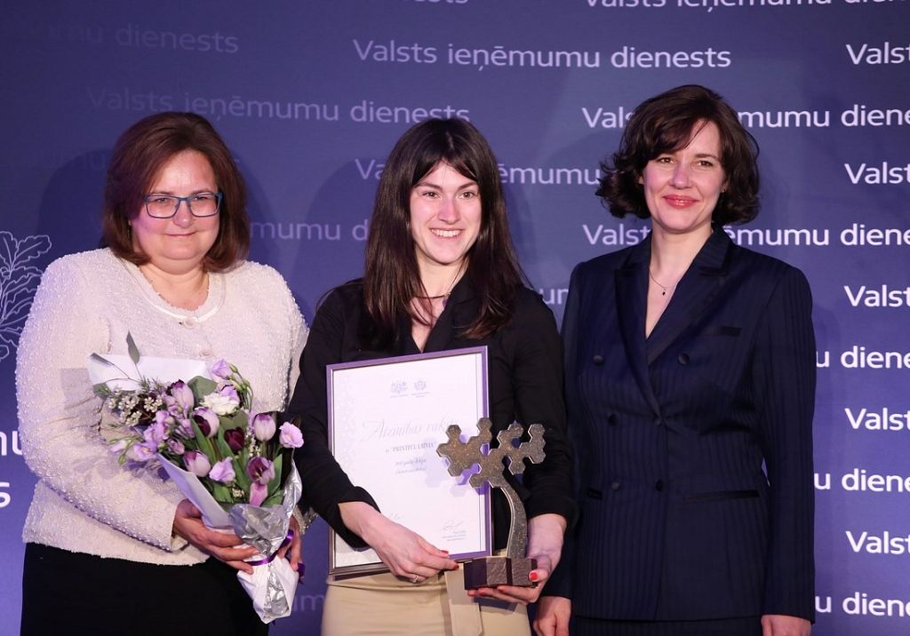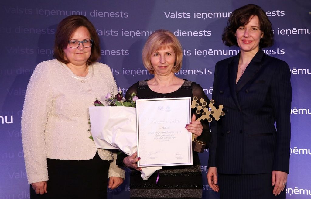 Valsts ieņēmumu (VID) dienesta ģenerāldirektora pienākumu izpildītāja Dace Pelēkā (no kreisās), SIA "Verems" pārstāve ar saņemto balvu kategorijā "2017.gada lielākais darbaspēka nodokļu maksātājs Latgales plānošanas reģionā vidējo nodokļu maksātāju grupā" un finanšu ministre Dana Reizniece-Ozola