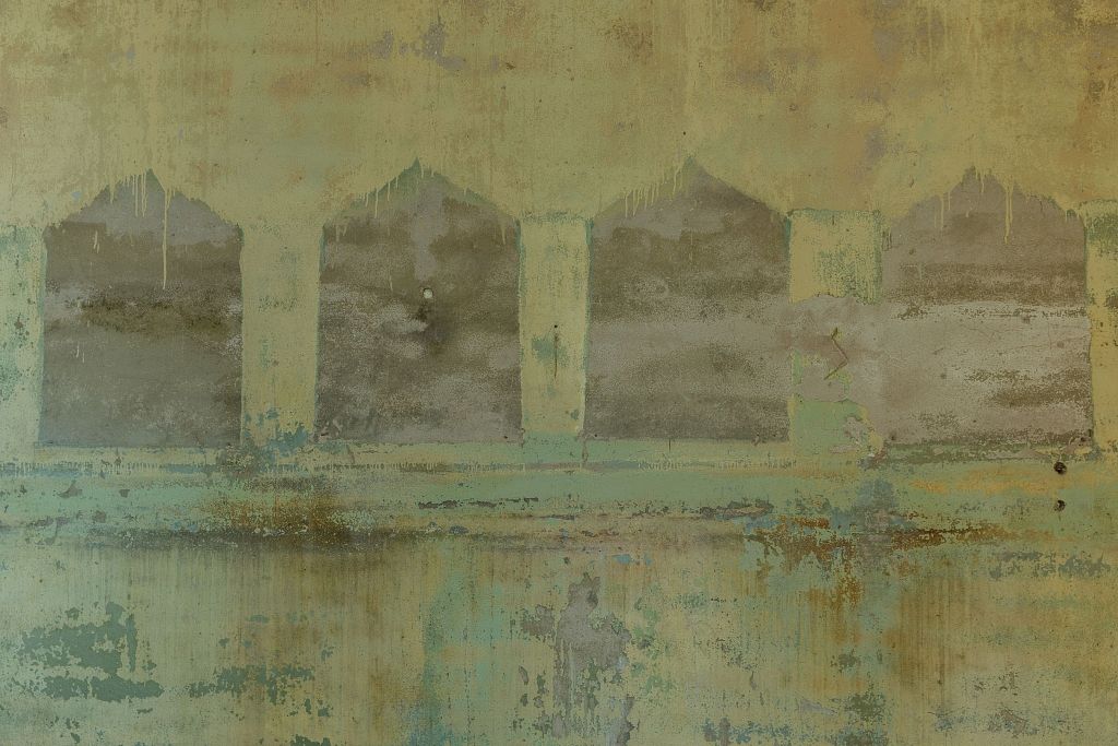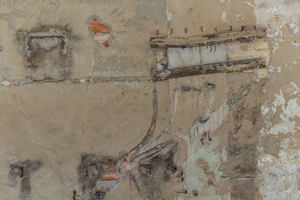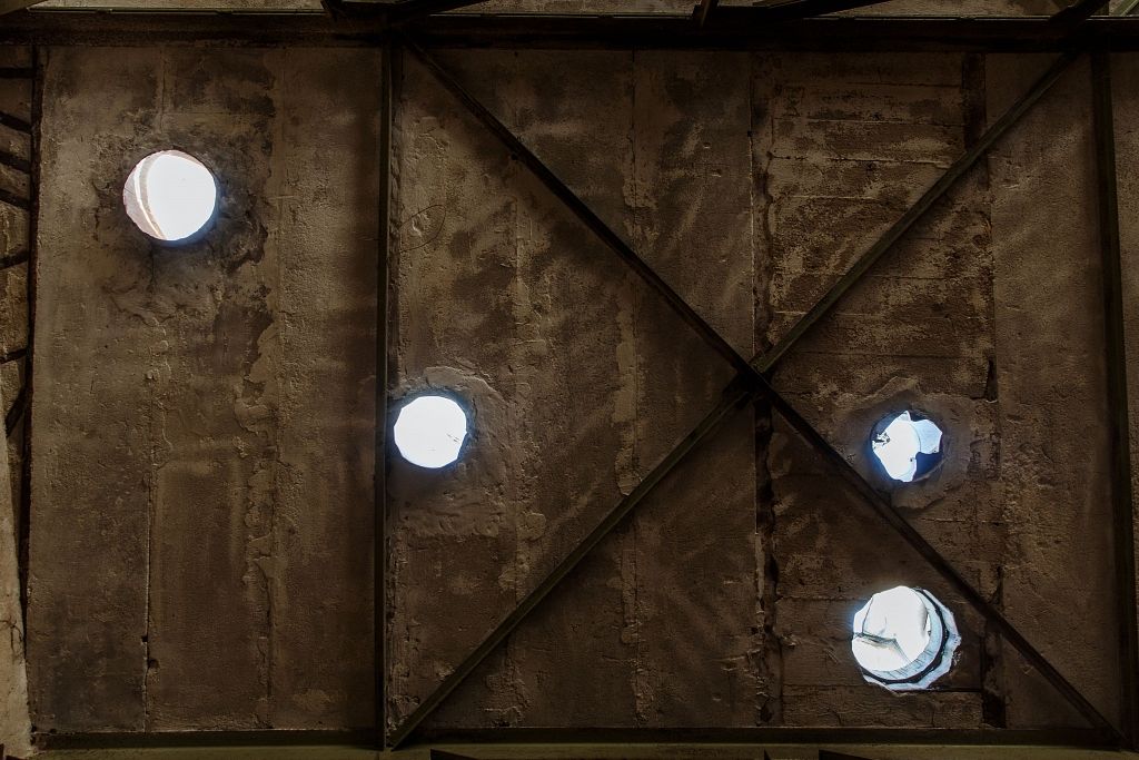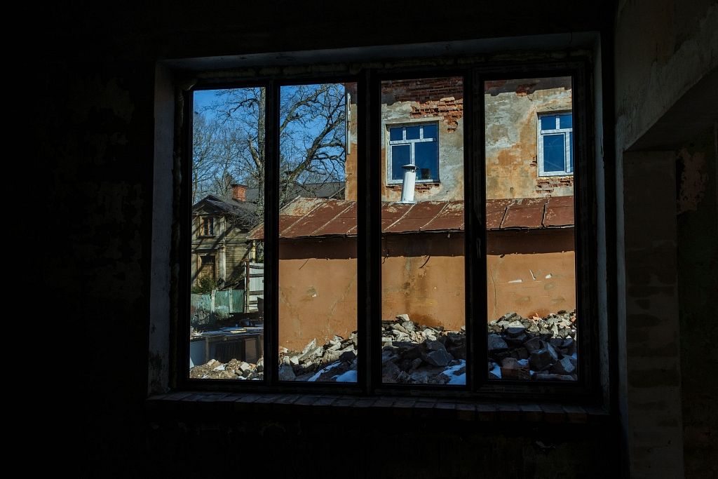 Telpu sienu krāsa noņemta ar smilšu strūklu un dažas vietās tā tiks atstāta tāda, kāda bijusi sākotnēji.