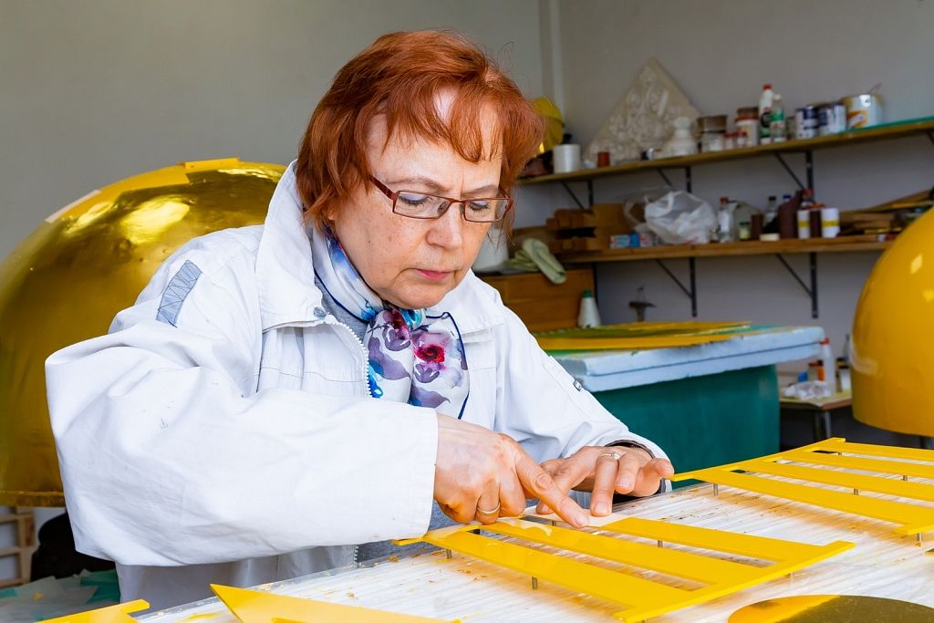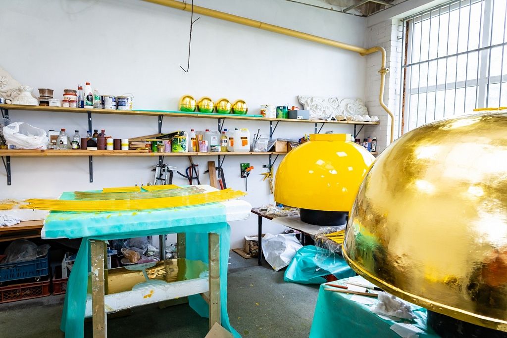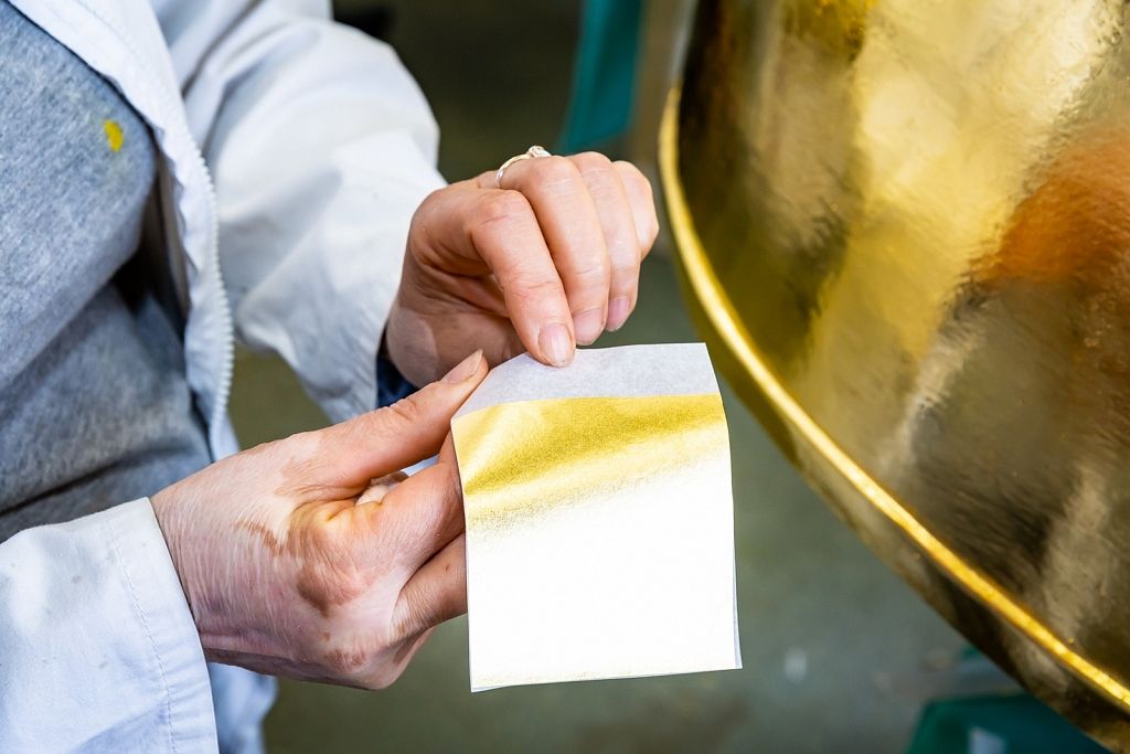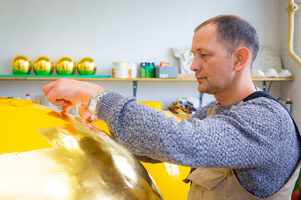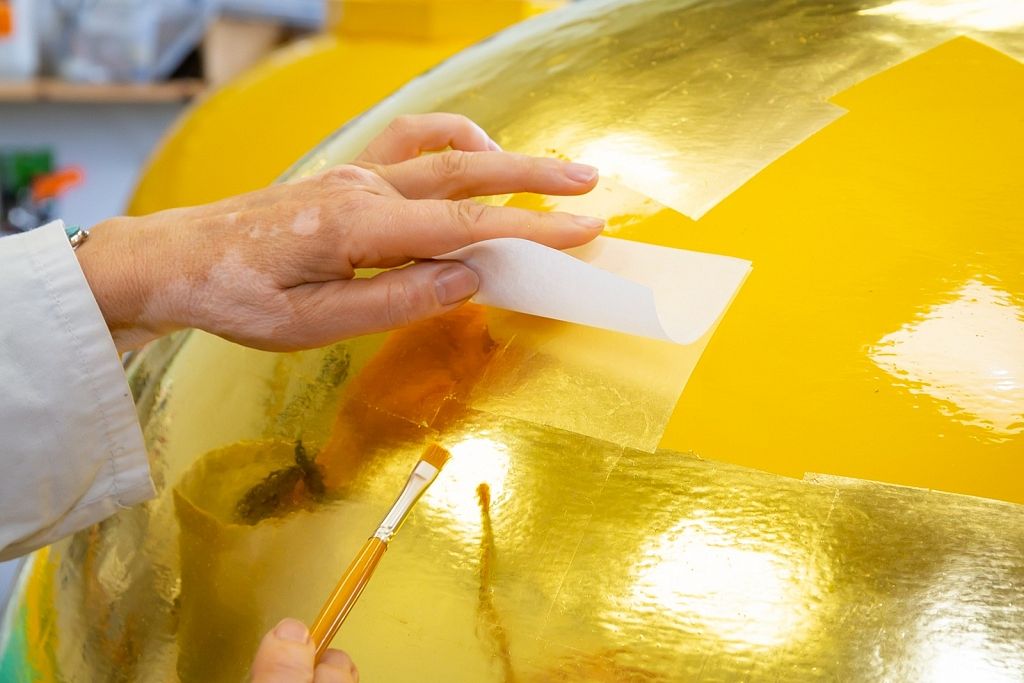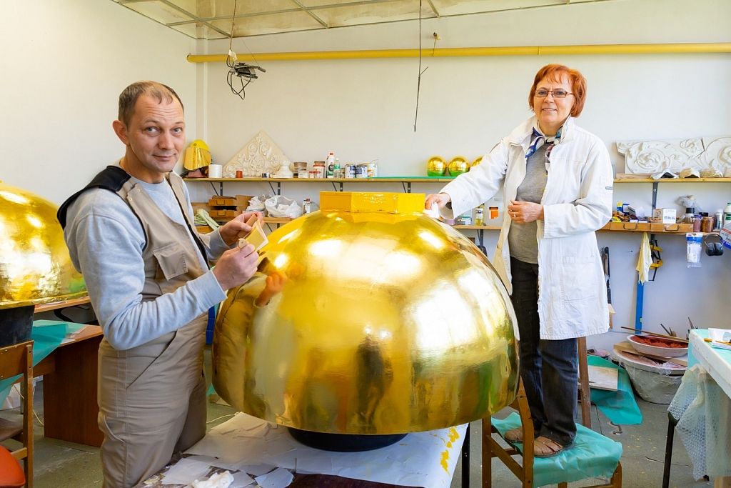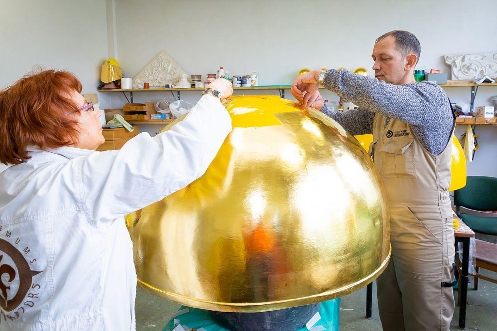 Savukārt zeltīšanas darbus 19,32 kvadrātmetru apjomā paveica uzņēmuma restauratore Inese Ozoliņa un viņas palīgs Raimonds Karveckis. No jauna ir izgatavots arī torņa smailes dekors, kas vēsturiski atradies zem bumbas, bet pēc iepriekšējiem jumta remontdarbiem nebija novietots atpakaļ.