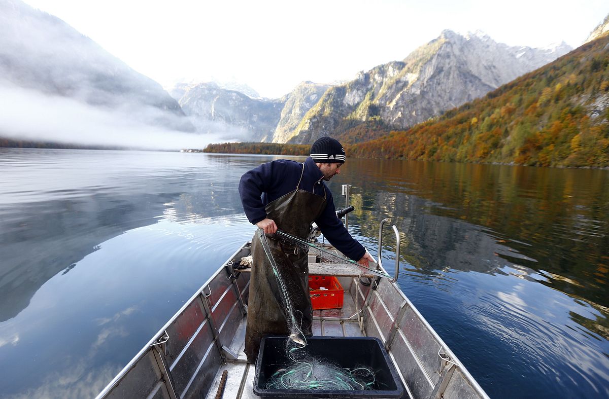 Aģentūras Reuters fotogrāfs Maikls Dalders viesojies pie Bavārijas zvejnieka Tomasa Amorta un iemūžinājis viņa darbu Kēnigszē ezerā.