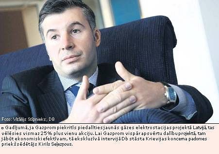 Tā ekskluzīvā intervijā Db stāsta šā Krievijas koncerna padomes priekšsēdētāja vietnieks, kā arī a/s Latvijas Gāze padomes priekšsēdētājs Kirils Seļezņovs. Viņš arī norāda, ka pēc jauno dabasgāzes tarifu apstiprināšanas, jau šogad tie Latvijā būs tādā pašā līmenī kā Vācijā, Francijā, Itālijā un citās ekonomiski attīstītajās Eiropas valstīs.