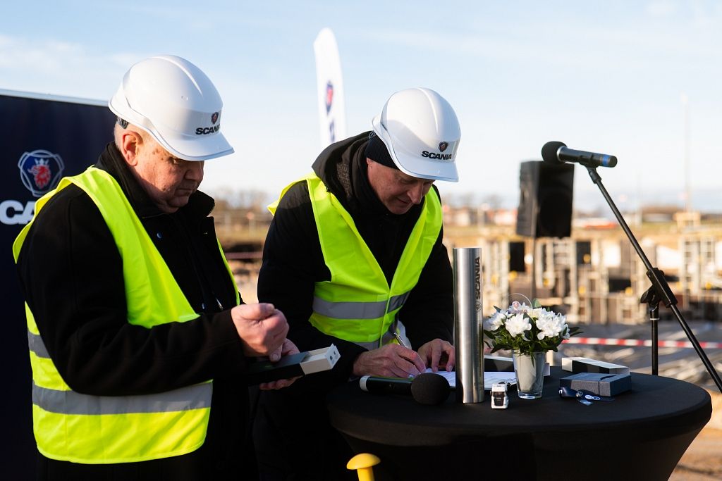 Liepājā, svinīgi iemūrējot laika kapsulu, Scania Latvia iezīmēja jaunā kravas automašīnu servisa un pārdošanas centra būvniecības pirmo posmu.