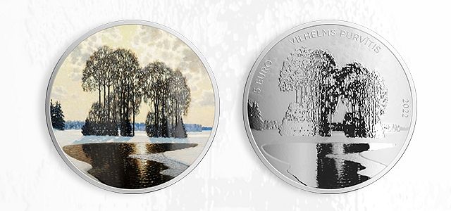 Mākslinieces radītā monēta interpretē Purvīša gleznā "Ziema" esošos elementus - ažūri majestātiskos bērzus, vizuļojošo neaizsalušā ezera ūdeni, apmākušās ziemas debesis - un eleganti pārceļ tos sudraba monētā, izmantojot dažādas intensitātes matējumus, tekstūras un spoguļvirsmu, atzīmē Latvijas Bankā.
