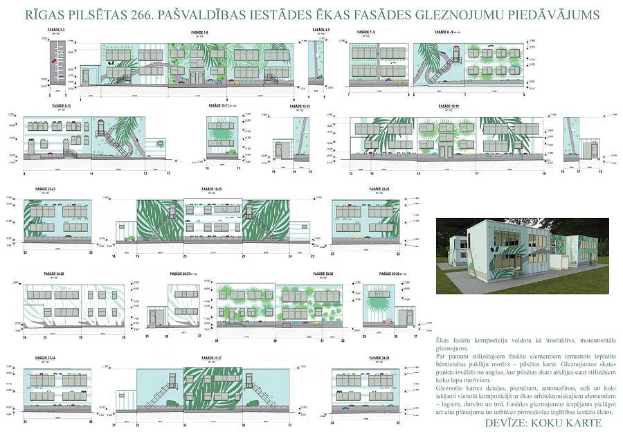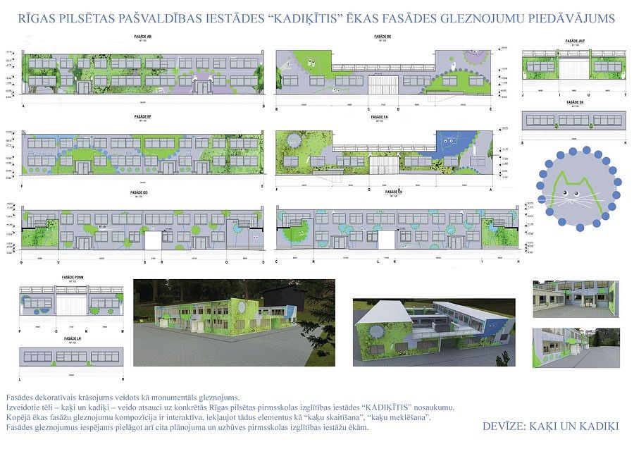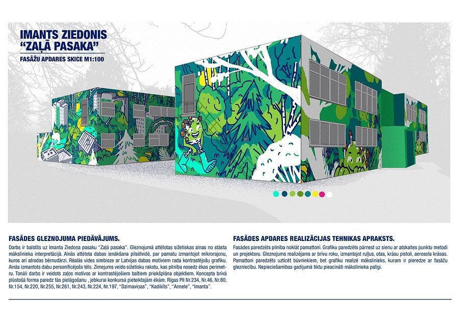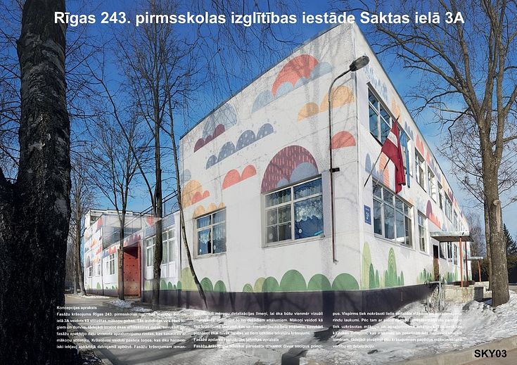 Šos darbus šogad realizēs uz 19 Rīgas izglītības iestāžu fasādēm, kurām pēc Rīgas domes Īpašuma departamenta pasūtījuma tiks veikti ēkas energoefektivitātes uzlabošanas pasākumi: Rīgas pirmsskolas izglītības iestāde “Māra” Zebiekstes ielā 1, Rīgas 266. pirmsskolas izglītības iestāde Pļavnieku ielā 4, Rīgas 259. pirmsskolas izglītības iestāde Jāņa Grestes ielā 3, Rīgas 270. pirmsskolas izglītības iestāde Salnas ielā 18, Rīgas 234. pirmsskolas izglītības iestāde Kurzemes prospektā 86C, Rīgas pirmsskolas izglītības iestāde Dzirnaviņas Tālavas gatvē 7, Rīgas 46. pirmsskolas izglītības iestāde Vecumnieku ielā 5A, Rīgas 80. pirmsskolas izglītības iestāde Garajā ielā 24, Rīgas pirmsskolas izglītības iestāde Kadiķītis Garajā ielā 31, Rīgas 154.pirmsskolas izglītības iestāde Andromedas gatvē 3, Rīgas 220. pirmsskolas izglītības iestāde Aglonas ielā 4A, Rīgas pirmsskolas iestāde Annele Anniņmuižas bulvārī 78, Rīgas 261. pirmsskolas izglītības iestāde Jaunrozes ielā 12, Rīgas 243. pirmsskolas izglītības iestāde Saktas ielā 3A, Rīgas 224.pirsmsskolas izglītības iestāde Prūšu ielā 82, Rīgas 197.pimrsskolas izglītības iestāde Birzes ielā 44, Rīgas 255.pirmsskolas izglītības iestāde Akadēmiķa M.Keldiša ielā 5, Rīgas 25.vidusskola Rušonu ielā 6.