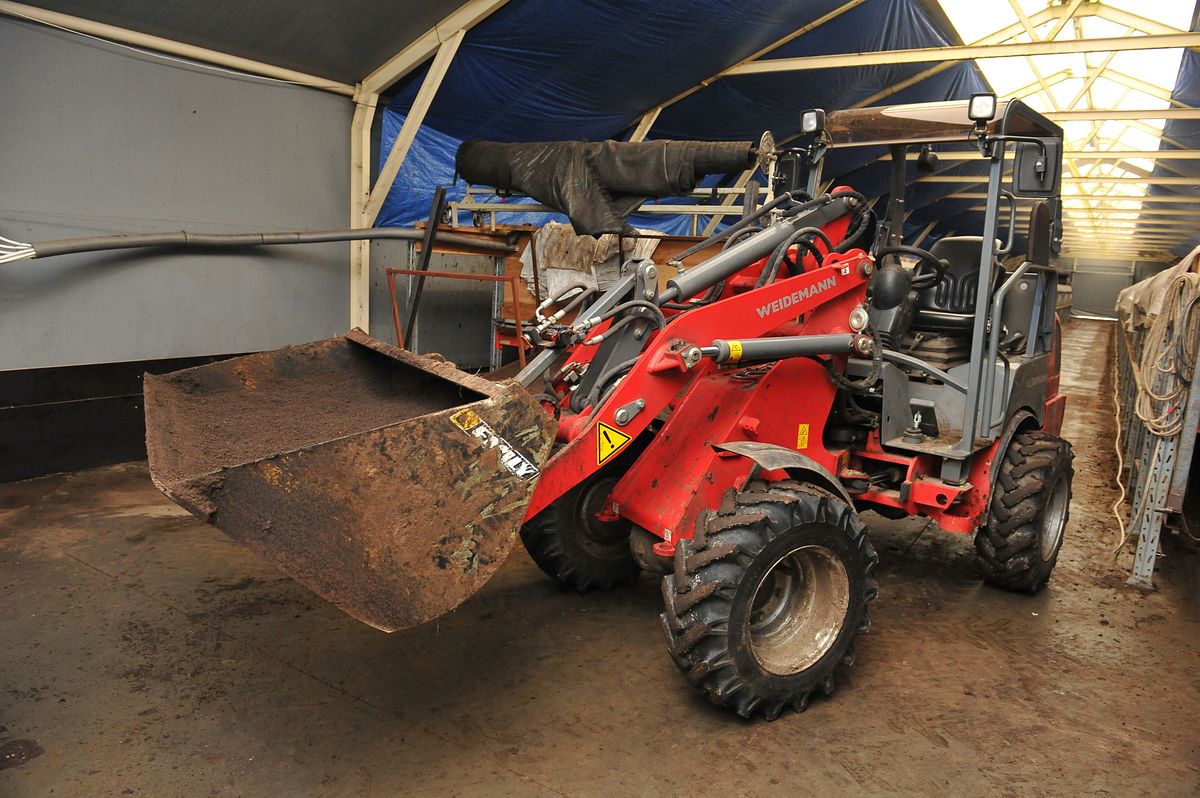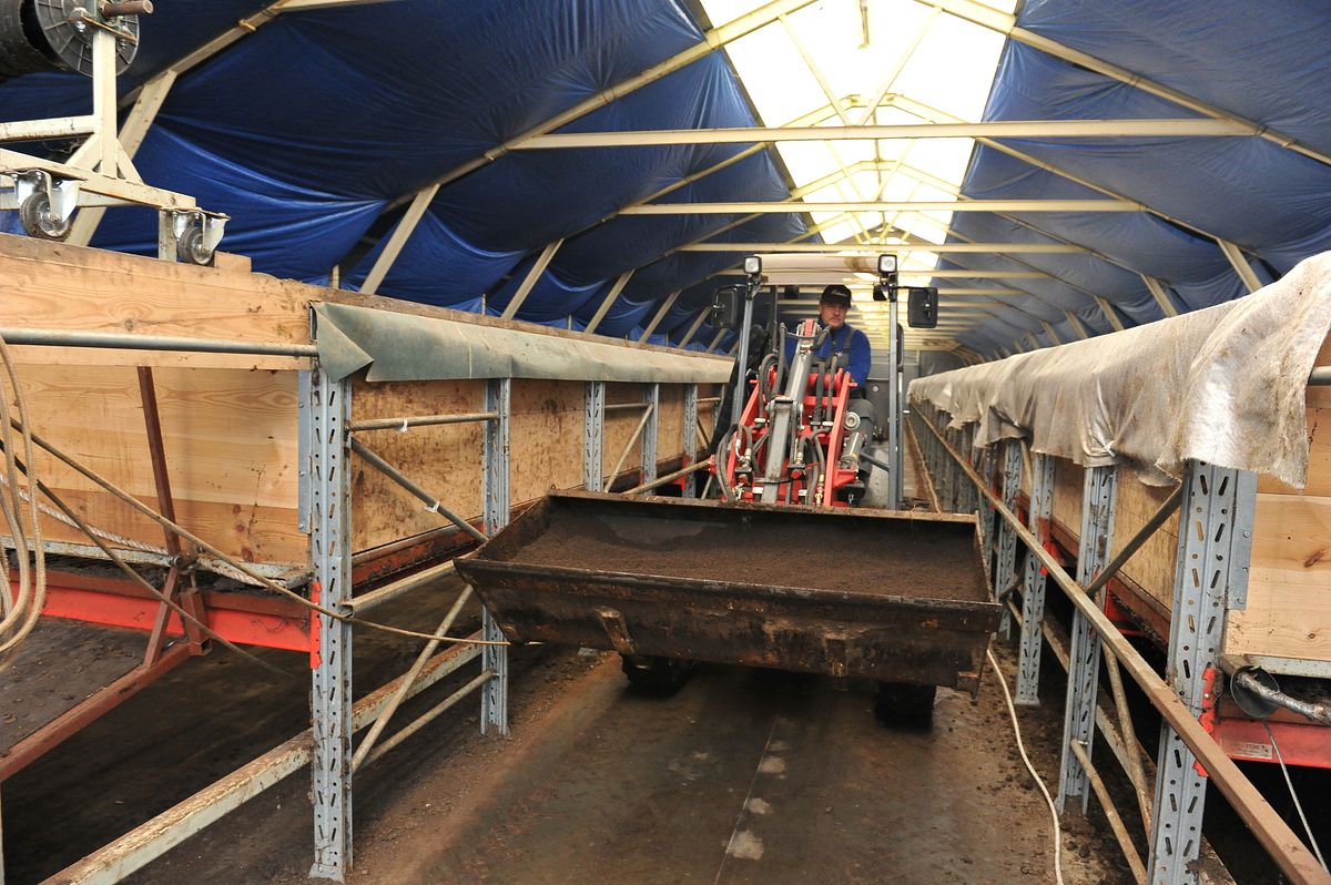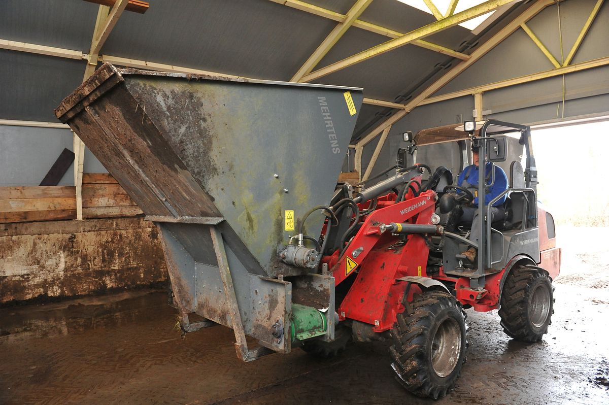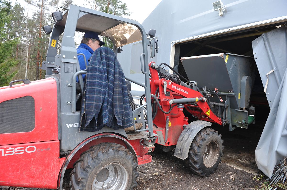 Traktoram pievienots barotājs, ar kuru sliekām tiek dota barība.