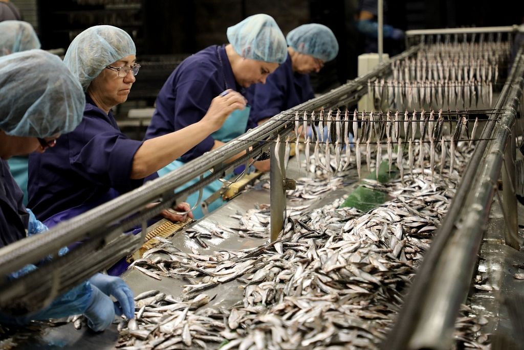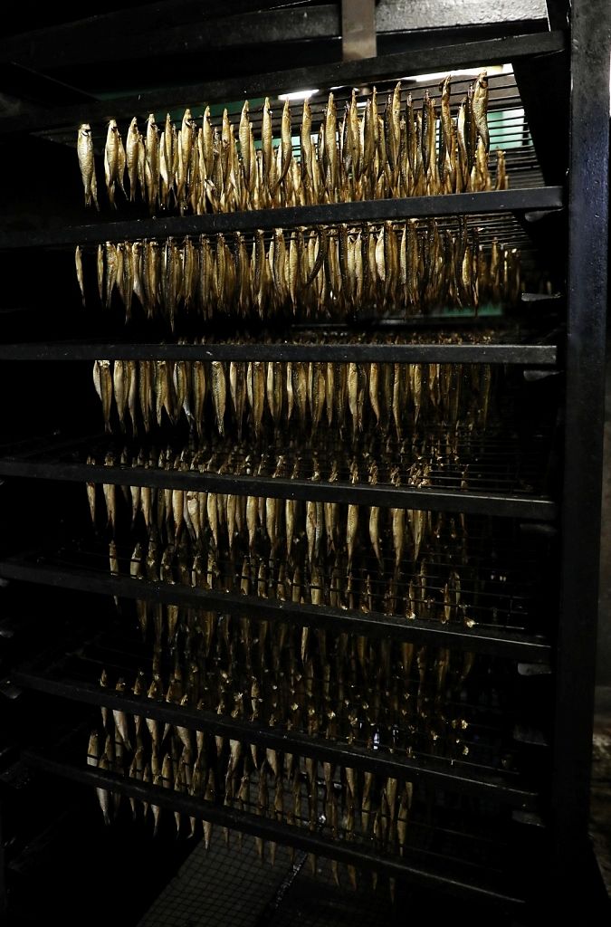 Katra darbiniece zivis liek speciālās kasetēs, lai uzvērtu tās uz metāla stieņa. Pēc tam zivis nonāk kūpināšanas tunelī.