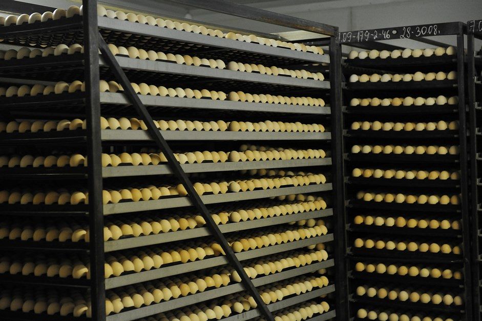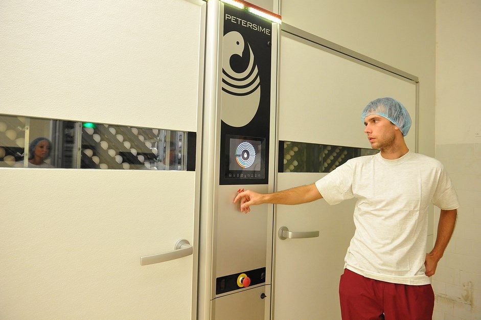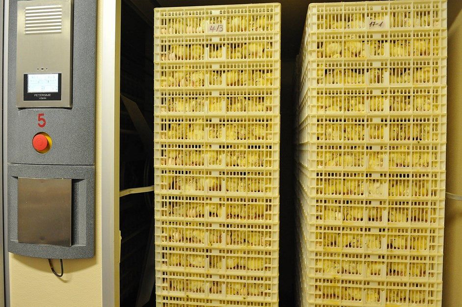 Tad tās nonāk inkubācijas skapī. Vienā skapī atrodas 57,6 tūkstoši olu. Vienā reizē tiek piepildīts uzreiz viens skapis. Ik pa divām stundām olas tiek apgrozītas, lai visas puses sildītos vienmērīgi, tāpat kā ligzdā.