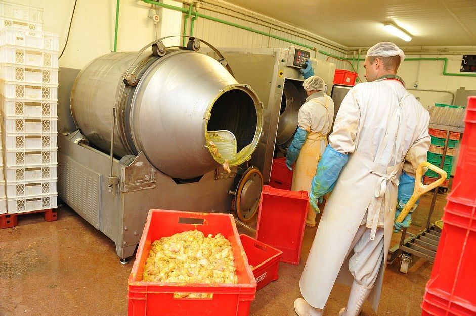 Dienā cehā tiek samarinētas vairākas tonnas vistas gaļas produktu.