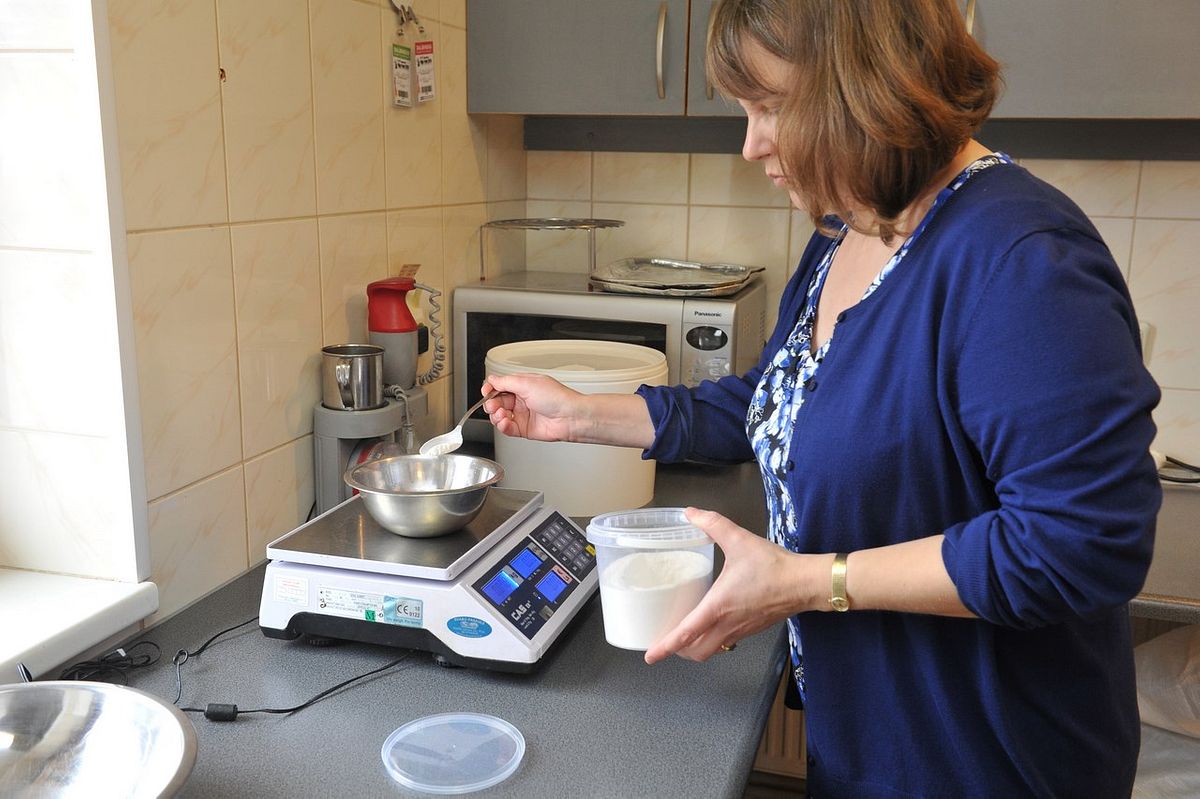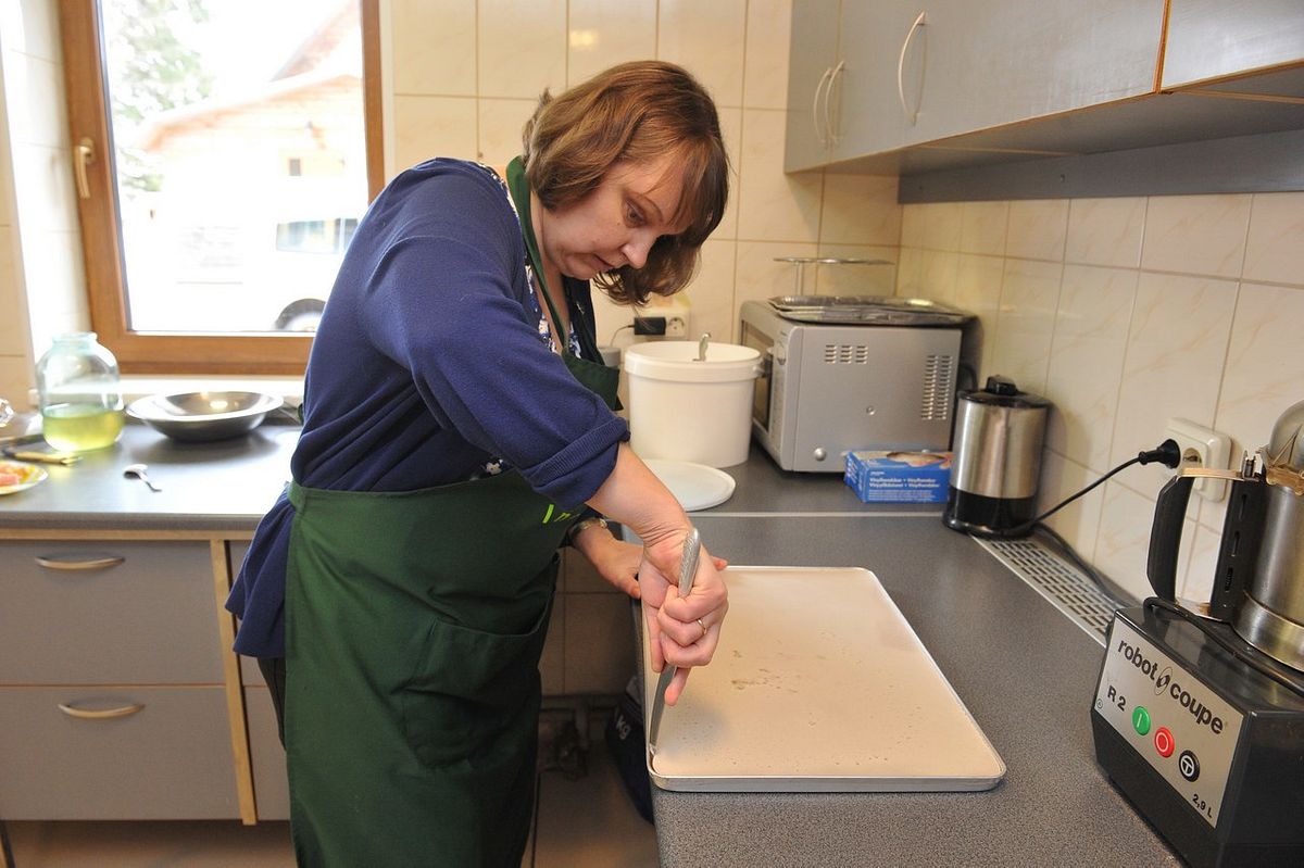 Kad masa sacietējusi, to ņem ārā no skapīša un griež mazos gabaliņos.