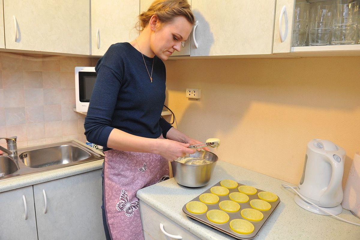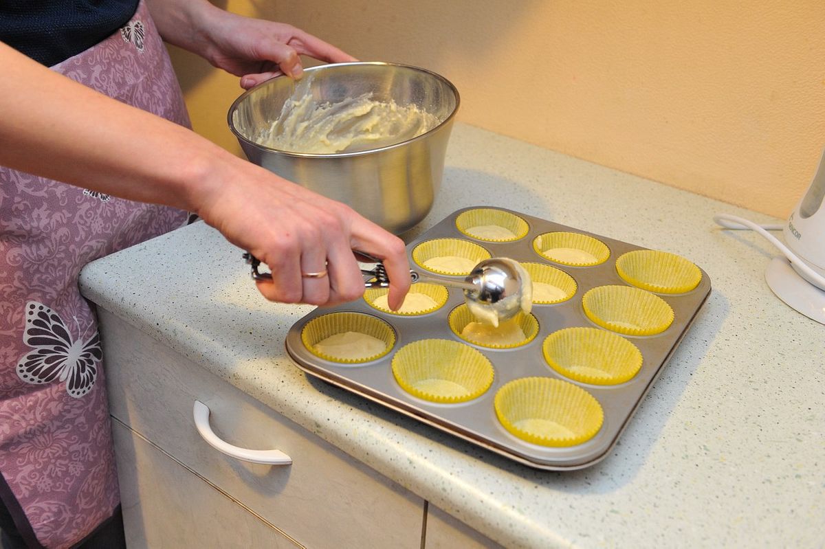 Kēksus liek cepeškrāsnī, kur tos cep 18-20 minūtes.
