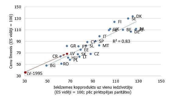 Pirmkārt, inflācija Latvijā ir maksa par ienākumu pieaugumu. Bagātajās valstīs cenas ir augstākas nekā nabadzīgajās valstīs – īpaši tas attiecas uz tādām netirgojamām precēm kā kafijas tasīte, frizētava vai taksometrs. Cieša pozitīva sakarība starp ienākumu līmeni un cenām pastāv arī starp Eiropas Savienības (ES) valstīm. Visās valstīs, kur ienākumi pieaug ātrāk nekā ES vidēji, straujāk pieaug arī cenas. Latvija ir viens no šādiem piemēriem.