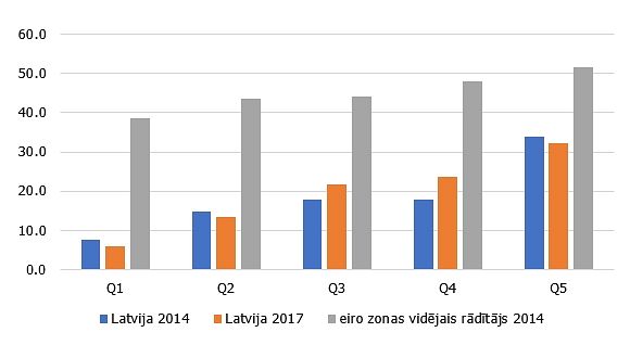 6. attēls. Mājsaimniecību īpatsvars katrā ienākumu kvintilē, kas veido uzkrājumus neparedzētiem gadījumiem (% no visām mājsaimniecībām attiecīgajā kvintilē)