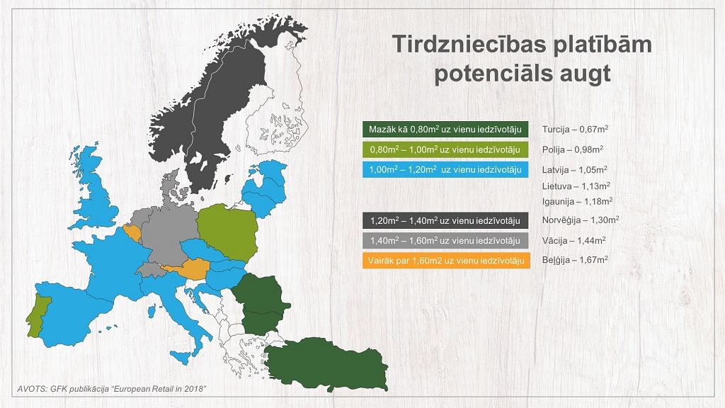 Tirgus pētījumu uzņēmums GFK veica Eiropas mazumtirdzniecības tirgus pētījumu par 2017.gadu, kur rezultāti rāda, ka vislielākā tirdzniecības platības uz vienu cilvēku ir Beļģijā – 1.67 m2. 2. un 3. vietā ir Austrija un Nīderlande, attiecīgi ar 1.66 m2 un 1.59 m2. Savukārt, vismazāk Turcijā un Polijā – 0.67 m2 un 0.98 m2. Baltijas valstis atrodas trešajā valstu grupā, kur vidēji uz vienu iedzīvotāju ir no 1 m2 līdz 1.2 m2 tirdzniecības platības.