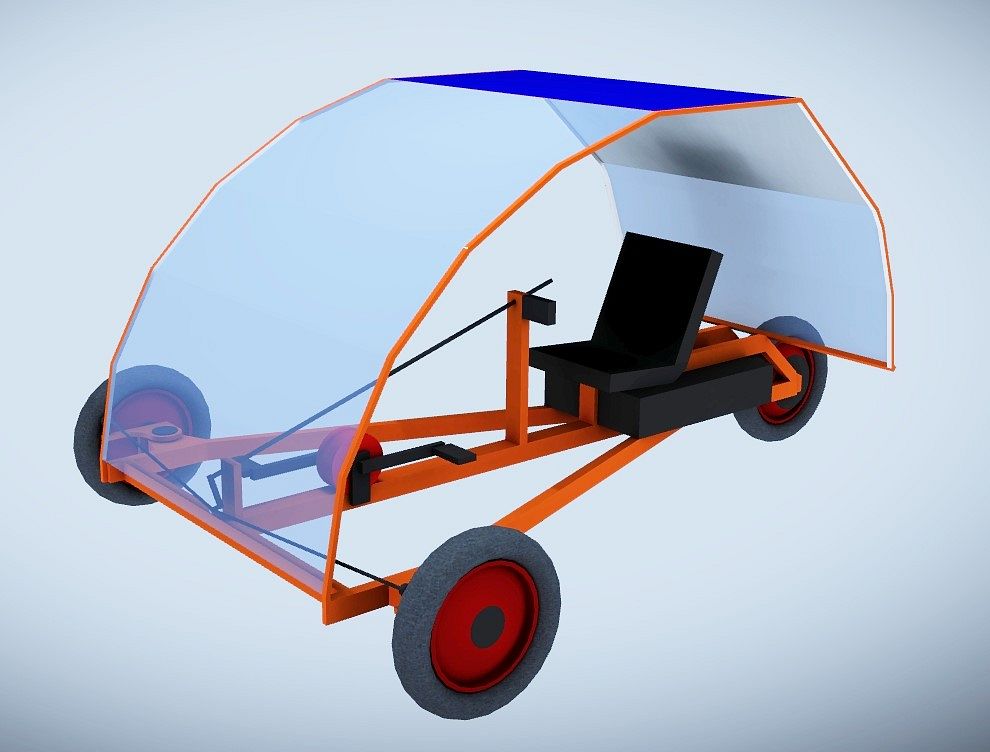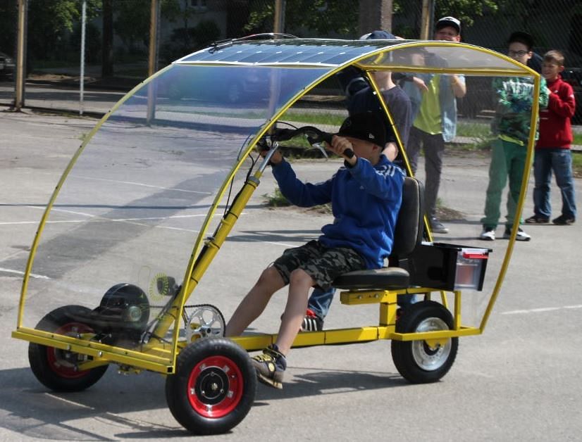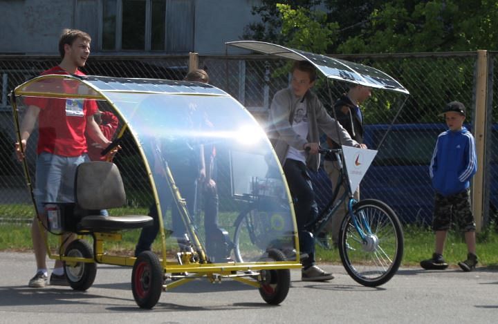 Novērtējot Saules enerģijas potenciālu un neizsmeļamību, trīs Latvijas Universitātes Cietvielu fizikas institūta jaunieši – Artis Volkovs, Artūrs Gruduls, Mārtiņš Vanags – kopā ar vecākajiem kolēģiem – konstruktoru Jāni Straumēnu un inženieri Vladimiru Ņemcevu – elektrovelosipēda rumbas motoru iemontēja pašu konstruētā tricikla aizmugurējā ritenī, un kājām lika ražot elektrību, griežot pedāļus velotrenažiera ģeneratoram. Papildu elektrisko enerģiju triciklam dod divi 100 W monokristāliska silīcija saules bateriju paneļi, kas izvietoti uz tricikla jumta.