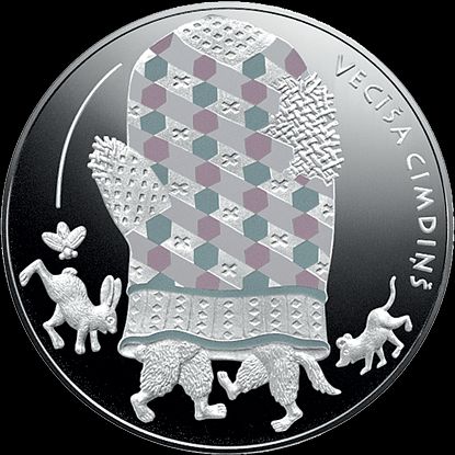 Monēta veltīta pasakai Vecīša cimdiņš, kuras morāle ieslēgta šķietami jautrā un panaivā stāstiņā, kaut ar mazliet skumjām beigām. Viedas dzīvošanas mācība pasakā sniegta metaforiski. Proti, katram cilvēkam jāiemācās cieņa pret dzīvību, līdzcietība pret nelaimē nonākušiem, līdzjūtība grūtībās un vēlme un prasme sadarboties, lai vairotu kopīgo labklājību.