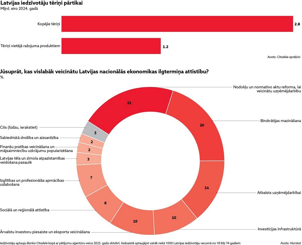 Šie rādītāji skaidri parāda sabiedrības gaidas pēc uzņēmējdarbībai draudzīgas nodokļu un valsts politikas. Tikai vidē, kur uzņēmējiem ir viegli strādāt un investēt, iespējams pilnībā izmantot Latvijas ekonomikas potenciālu. Tieši ar uzņēmējdarbības vidi saistīts arī tas, cik lielu pienesumu Latvijas ekonomikai var sniegt vietējo produktu patēriņš. Citadeles analīze atklāj, ka iedzīvotāji pārtikai ik gadu iztērē ap 2,8 miljardiem eiro, taču par vietēji ražotajiem produktiem tērējam tikai ap 1,2 miljardiem – mazāk nekā pusi. Lielākā daļa pārtikas groza tiek aizpildīta ar importētām precēm, un ekonomiskais pienesums aizplūst uz citām valstīm.Tieši valsts noteiktie apstākļi nosaka, vai uzņēmumi spēj šo pieprasījumu izmantot pilnā apmērā. Ja nodokļu vide un birokrātiskais slogs kļūst vieglāks, uzņēmumiem ir reāla iespēja investēt jaudās, paplašināt ražošanu un mazāk paļauties uz importu. Latvijas ražotāji ir konkurētspējīgi – viņiem vienkārši nepieciešama vide, kas veicina vēl lielāku izaugsmi.Valstij jāveido uzņēmējdarbībai labvēlīgi apstākļi, savukārt iedzīvotāji ar savām ikdienas izvēlēm var būtiski ietekmēt vietējās ekonomikas apriti. Arī viens papildu vietējais produkts pirkumu grozā ir solis spēcīgākas Latvijas virzienā.