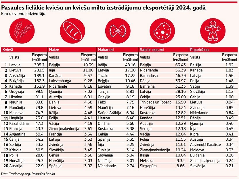 Makaroni ir kviešu miltu pārstrādes produkts, kas, salīdzinot ar maizi, ir ar ilgāku realizācijas laiku un mazākām transporta izmaksām uz produkcijas svara vienību. 2024. gadā pēc kopējiem ienākumiem no makaronu eksporta (34,1 miljons eiro, 0,57% no pasaules eksporta tirgus ) Latvija bija 21. vietā pasaulē. Latvijas daļa globālajā makaronu eksportā bija gandrīz tikpat liela, cik Ķīnai (35,6 miljoni eiro, 0,59% no pasaules eksporta tirgus, 20. vietā pasaulē). Pēc ienākumiem no makaronu eksporta uz vienu iedzīvotāju 2024. gadā Latvija ar 18,3 eiro bija 3. vietā pasaulē, atpaliekot tikai no Itālijas (50 eiro uz vienu iedzīvotāju) un Esvatīni (22,8 eiro uz vienu iedzīvotāju). Lietuva ar 4,3 eiro uz vienu iedzīvotāju bija 10. vietā pasaulē, bet Igaunija ar 49 centiem uz vienu iedzīvotāju bija 50. vietā pasaulē. Jāatzīmē, ka 2023. gadā pēc makaronu eksporta uz vienu iedzīvotāju Latvija ar 17,4 eiro uz vienu iedzīvotāju bija 2. vietā pasaulē, atpaliekot tikai no Itālijas (48,2 eiro uz vienu iedzīvotāju).