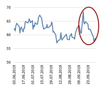 Pēdējo mēnešu laikā tirgus vairākas reizes pārskatīja naftas cenu prognozes uz leju. Investoru bažas noteica gan lēnāks globālās ekonomikas attīstības temps (kas nozīmē arī mazāku pieprasījumu pēc naftas produktiem), gan arvien pieaugošā naftas ieguve ASV. Šķita, ka situācija būtiski mainījās 14. septembrī, kad uzbrukumā cieta vairāki Saūda Arābijas naftas rūpniecības objekti, tajā skaitā pasaules lielākā naftas pārstrādes rūpnīca Abkaikā. Jau pirmajās stundās pēc biržas atvēršanas tas noteica naftas cenas kāpumu par vairāk nekā 10%.