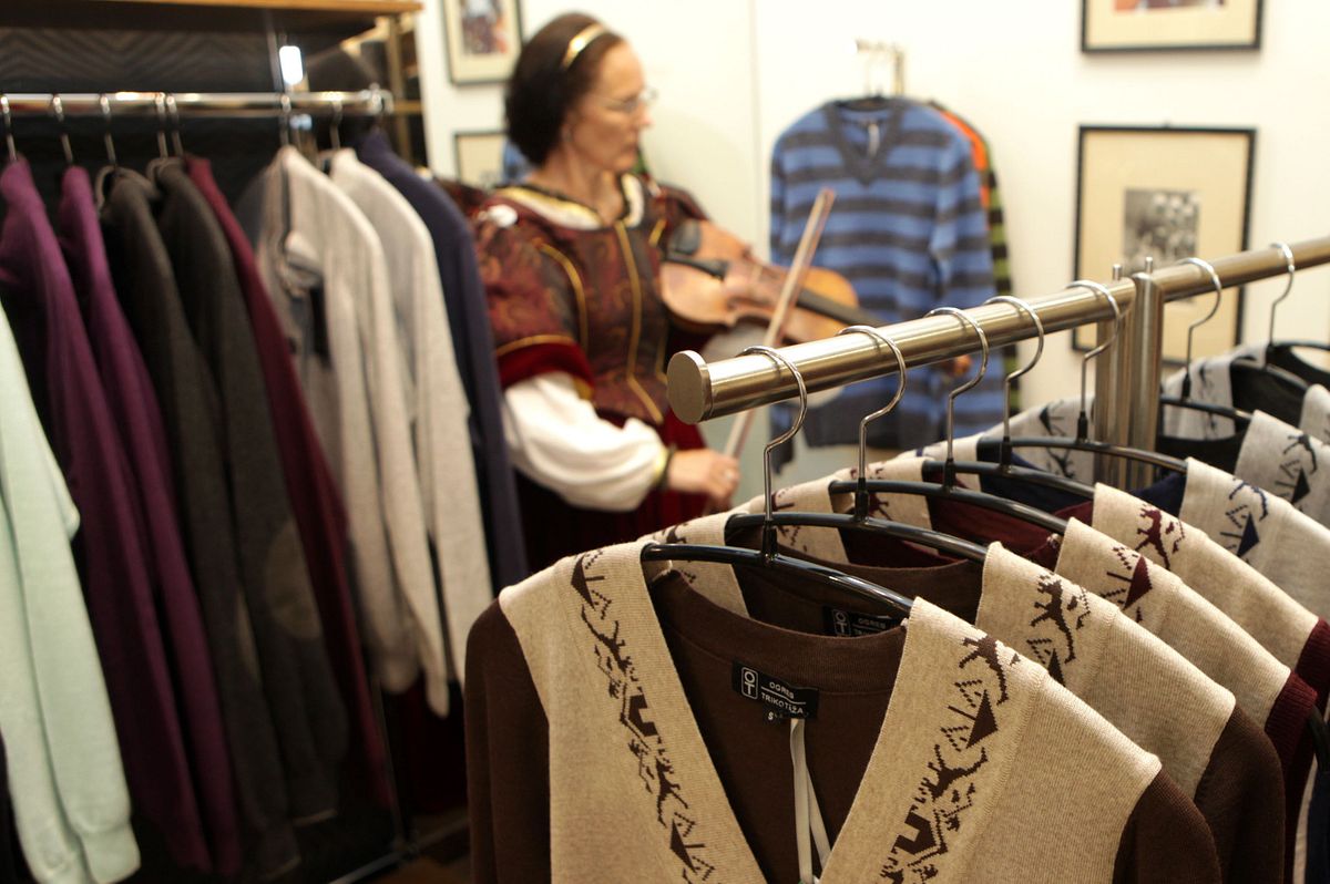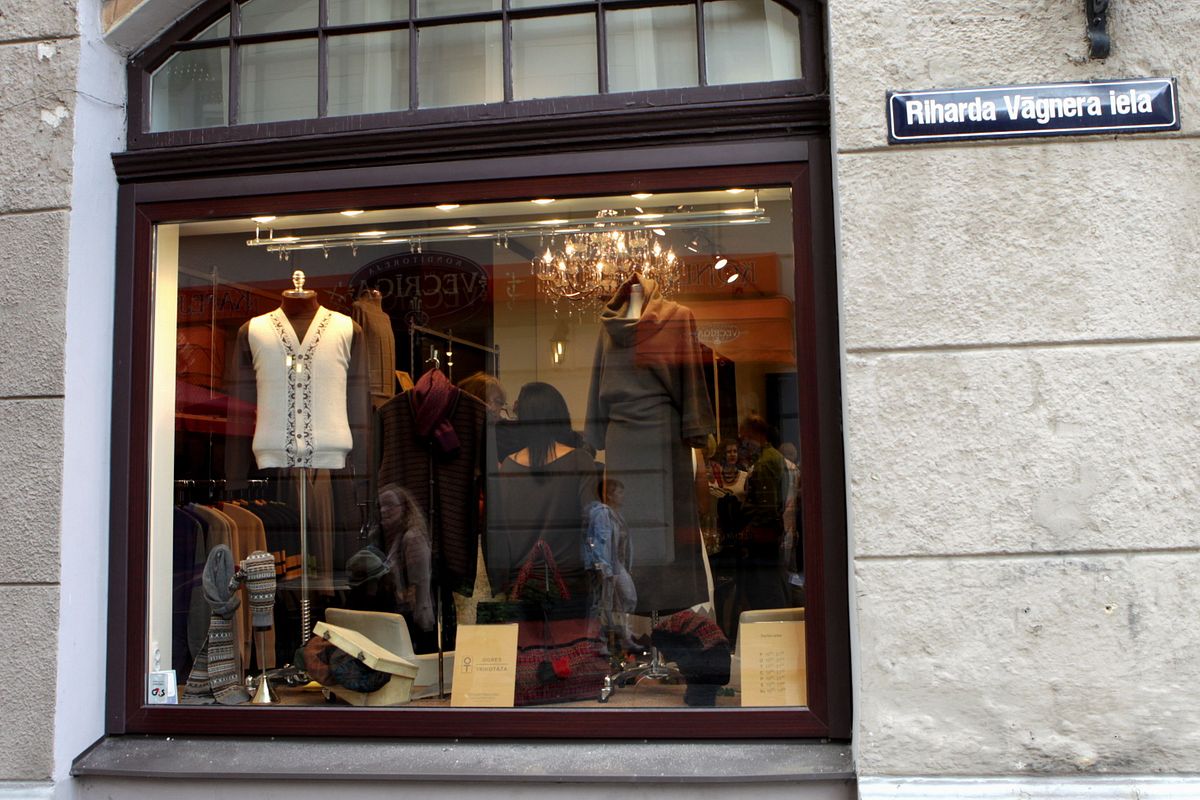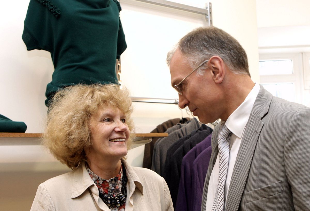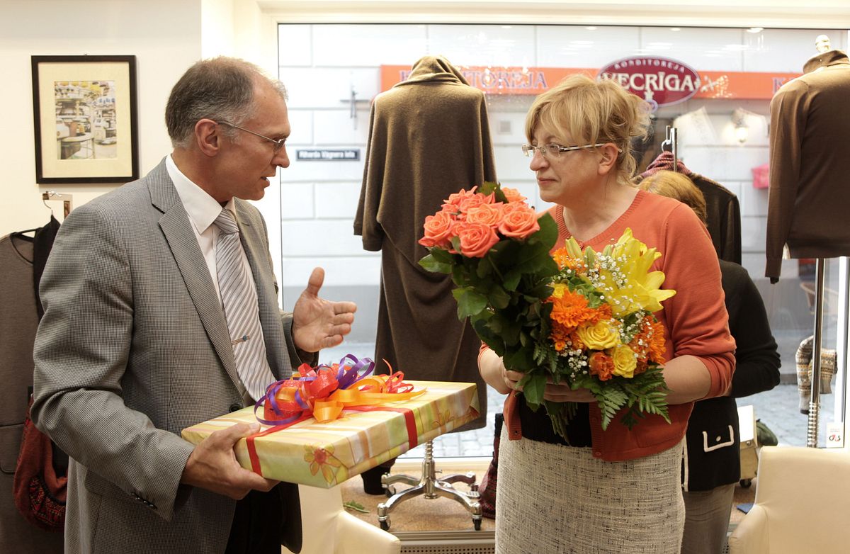 Ogres Valsts tehnikuma vadītāja Ilze Brante un Ogres novada domes priekšsēdētājs Edvīns Bartkevičs piedalās trikotāžas ražotāja "OT Ogres trikotāža" jaunā veikala atklāšanas pasākumā Vecrīgā.
