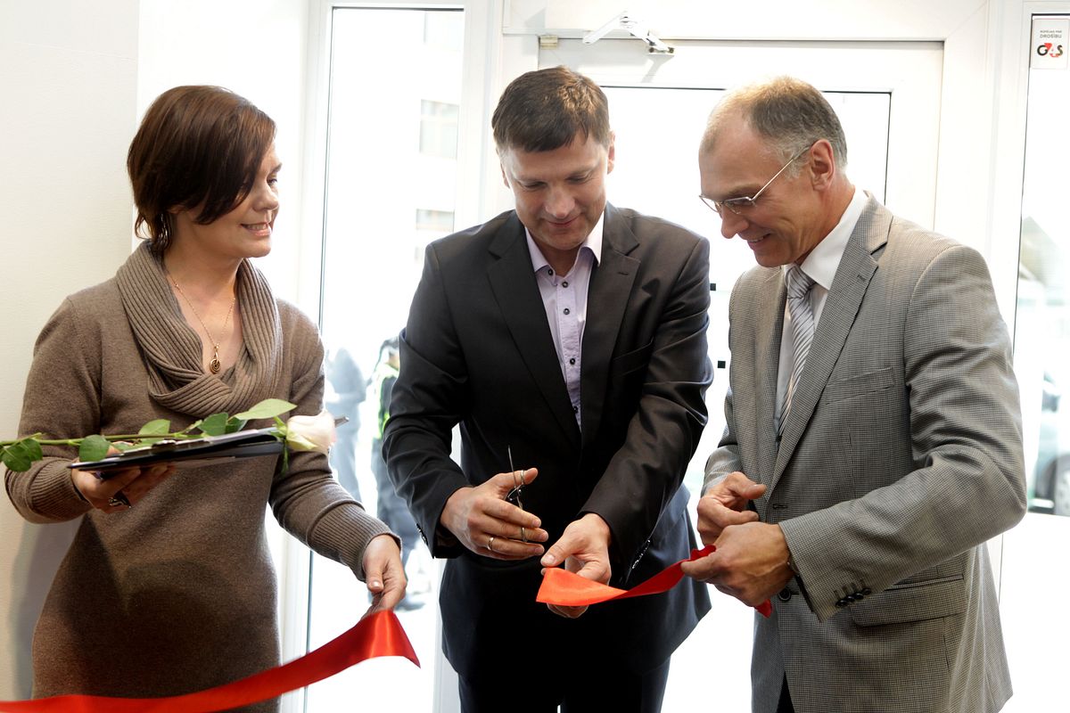 "OT Ogres Trikotāžas" sabiedrisko attiecību speciāliste Maruta Bukleviča, "Ogres Trikotāžas" izpilddirektors Armands Lapiņš un Ogres novada domes priekšsēdētājs Edvīns Bartkevičs griež lentu trikotāžas ražotāja "OT Ogres trikotāža" jaunā veikala atklāšanas pasākumā.