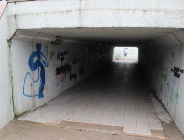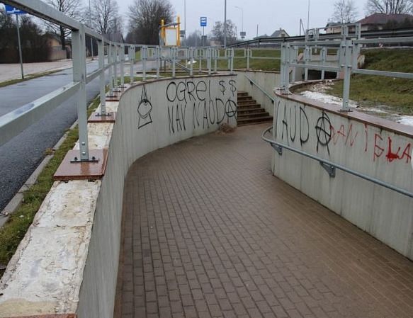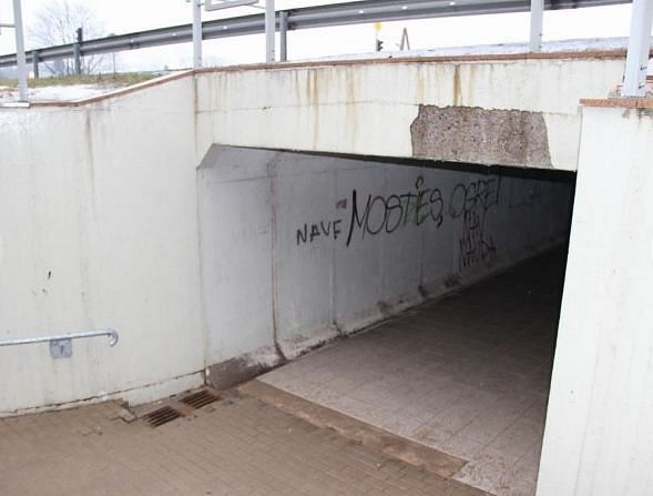Cits skats paveras, mērojot ceļu uz Akmeņu ielas autobusu pieturu. Gaumīgās akmens flīzes, kas sedz monolītās tuneļa sienas zem aizsargbarjerām Kaļķu un arī Akmeņu ielas pusē pamazām pazūd. Kāds (vai kādi) ir krietni nopūlējušies, lai tās atdauzītu un aiznestu prom, norāda medijs. Līdzīgs liktenis piemeklējis arī gājēju ceļa flīzes, to skaits neglābjami samazinās. Nu jau izkustināti no vietas nelielie bruģakmeņi, daļa aizstiepta prom. Drīz laikam būs apķēpātas tuneļa sienas abās pusēs visā garumā. Par gaumīgiem vai estētiskiem šos zīmējumus vis nenosaukt.