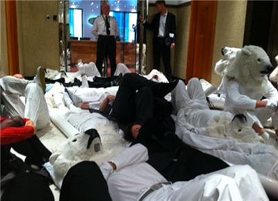 Desmitiem Greenpeace aktīvistu, kuri ģērbušies kā polārlāči, «uzbrukuši» Skotijas uzņēmumam, kas iesaistīts naftas izpētē Arktikā, ziņo BBC.