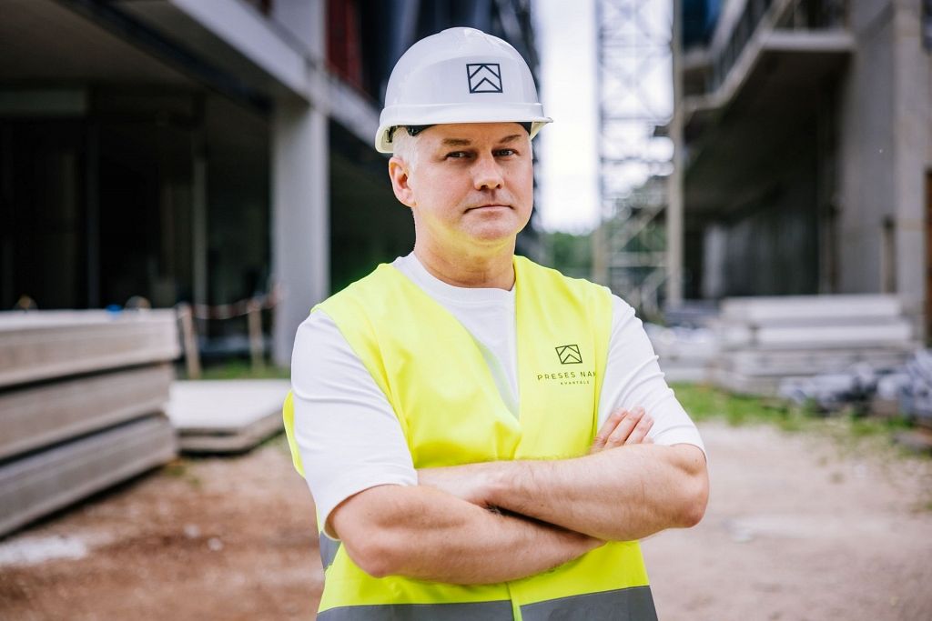 "PN Construction Latvia" celtniecības direktors Ivars Kļavinskis informē, ka pašlaik notiek aktīvi būvdarbi vairākos ēkas līmeņos - tiek montēti sienu paneļi ēkas 11. jeb pēdējā stāvā, uzstādītas metāla konstrukcijas ēkas galos un montētas sijas liftu šahtās.