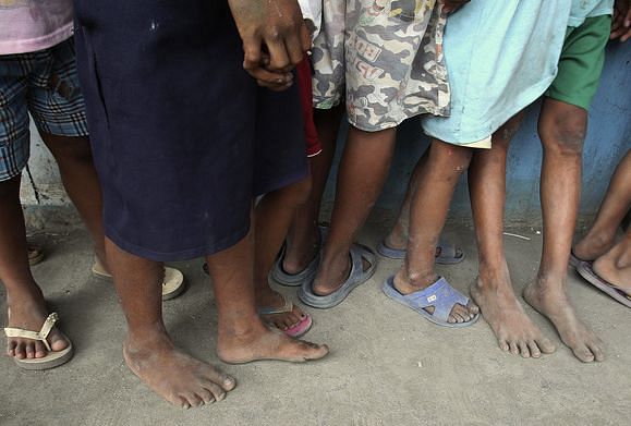 Kāda māte, kuru pavadījuši viņas pieci bērni, fotogrāfam stāstījusi: «Es vedu savus bērnus uz šejieni, jo mēs nevaram atļauties viņus barot trīs reizes dienā.»