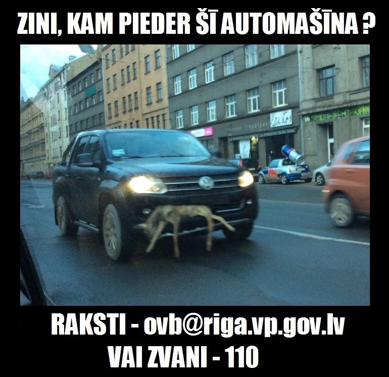 Automašīna, iespējams, Volkswagen Amarok, braukusi virzienā no centra, un tās priekšējā bamperī bija iesprūdusi stirna. Automašīnas valsts numura zīme, iespējams, bijusi aizlikta aiz priekšējā vējstikla, taču to nav izdevies fiksēt.