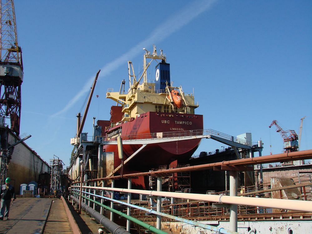 No kuģu būvētavas doka ir aizkuģojis kravas kuģis UBC Tampico, kurš peld zem Kipras karoga un kura pieraksta osta ir Limasola. UBC Tampico garums ir 182,6 metri, platums – 28,6 metri, kravnesība – 37,8 tūkstoši tonnu. Kravas kuģis atbilst Panamax klasifikācijai, - šāds platuma ierobežojums ir nepieciešams, lai kuģis varētu caurbraukt Panamas kanālu, kas savieno Kluso un Atlantijas okeānu.