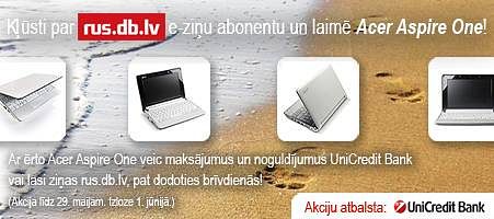 Portāls rus.db.lv sadarbībā ar UniCredit Bank piedāvā akciju, kuras uzvarētājs saņems klēpjdatoru Acer Aspire One. Lai piedalītos akcijā un laimētu klēpjdatoru, akcijas laikā jāpiesakās uz rus.db.lv ziņu saņemšanu e-pastā.