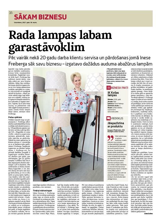 Iepriekš viņa darba pieredzi guvusi dažādos uzņēmumos, tostarp lielās starptautiskās kompānijās. Pagājušajā vasarā, brīdī, kad I. Freiberga bija nolēmusi mainīt darbu, viņa sāka prātot par sava biznesa sākšanu. Idejas bija vairākas, bet lampu abažūru izgatavošana un veco lampu atjaunošana izrādījās spēcīgākā no visām, to viņa iecerēja arī izmēģināt attīstīt kā biznesu. «Manī pavērās radošā stīga, kad iekārtoju savu mājokli, nolēmu pati izgatavot lampām abažūrus, kas saskanētu ar kopējo interjeru. Sapratu, ka šī lieta mani aizrauj, un pašmācības ceļā sāku apgūt šī amata prasmes,» stāsta zīmola Košas lampas idejas autore, meistare Inese Freiberga.