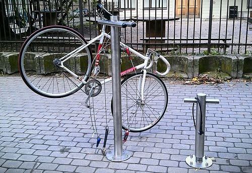 Pašapkalpošanās «darbnīcu» veido divi statīvi – vienā metāla auklās piestiprināti instrumenti velosipēda labošanai, bet otru statīvu var izmantot kā rokas pumpi velosipēda riepu piepumpēšanai.