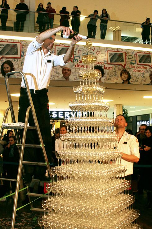 Valentīna dienā modes un izklaides centrā Rīga Plaza izveidota piramīda no 819 šampanieša glāzēm, kas sniedzās 2,21 m augstumā.