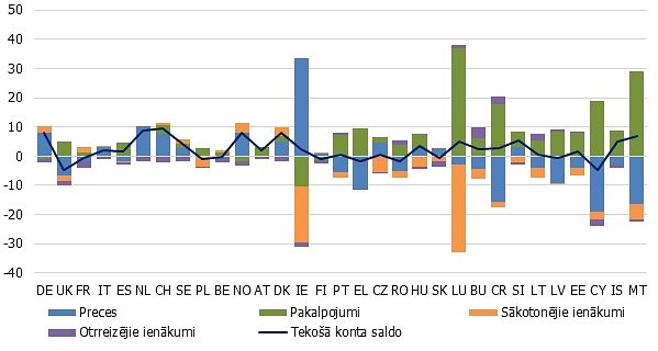 Iespējas nodrošināt pakalpojumu konta pozitīvo saldo šajās valstīs izriet no vairākiem faktoriem. Piemēram, dabas apstākļiem un kultūras mantojuma, kas veicina tūrismu; ģeogrāfiskā novietojuma, kas veicina pārvadājumu transporta pakalpojumu attīstību, kā arī no attīstīta finanšu pakalpojumu piedāvājuma. Savukārt sākotnējo ienākumu konta negatīvo saldo nereti veido iepriekšējo gadu ārvalstu tiešo investīciju (ĀTI) aktivitāte, tostarp, ja veiksmīgi piesaistītas ĀTI spējušas segt tekošā konta deficītu. Ārvalstu investoriem gūstot ienākumus, tie var tikt izvesti atpakaļ uz ārvalstīm vai reinvestēti (ieguldīti uzņēmuma attīstībā).