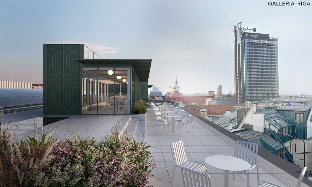 3 200 m² plašā jumta terase kļūs par augstāko publisko laukumu Rīgā - terase apvienos restorānus, kafejnīcas, pasākumu zonas, zaļās oāzes un atpūtas vietas, kā arī skriešanas celiņu ap stikla ātriju.