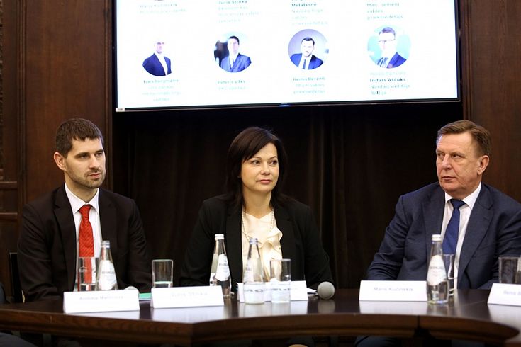 Premjers Māris Kučinskis (no labās), Nasdaq Riga valdes priekšsēdētāja Daiga Auziņa-Melalksne un Ekonomikas ministrijas valsts sekretārs Juris Stinka atzīst, ka lielāko valsts