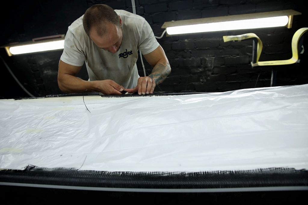 Tiek uzlikta viena kārta ar karbonu, kas aizņem aptuveni vienu stundu, bet pēc tam 24 stundas jāgaida kamēr dēlis žūst, tāpēc paralēli tiek izgatavoti vismaz trīs līdz četri sup dēļi.