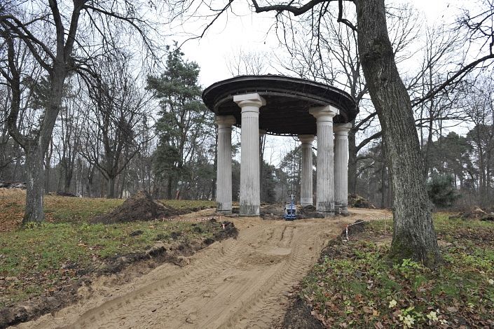 Līdz šim ir uzbūvēts dārznieka mājas karkass, bet koka namiņš pie galvenās ieejas parka teritorijā, kur pēc rekonstrukcijas izvietosies informācijas centrs, tiks atjaunots nākamajā gadā. Arī pārējie objekti parka teritorijā – rotonda, grota, lapene, tējnīca, nožogojums – tiks atjaunoti pēc tam, kad teritorijā pilnībā būs ierīkotas inženierkomunikācijas un veikti visi ceļu un laukumu sagatavošanas darbi.