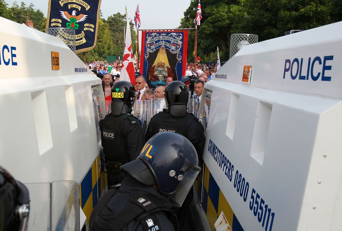Policijas apsargāts unionistu gājiens, 12. jūlijā, kas pārauga unionistu radītos nemieros
